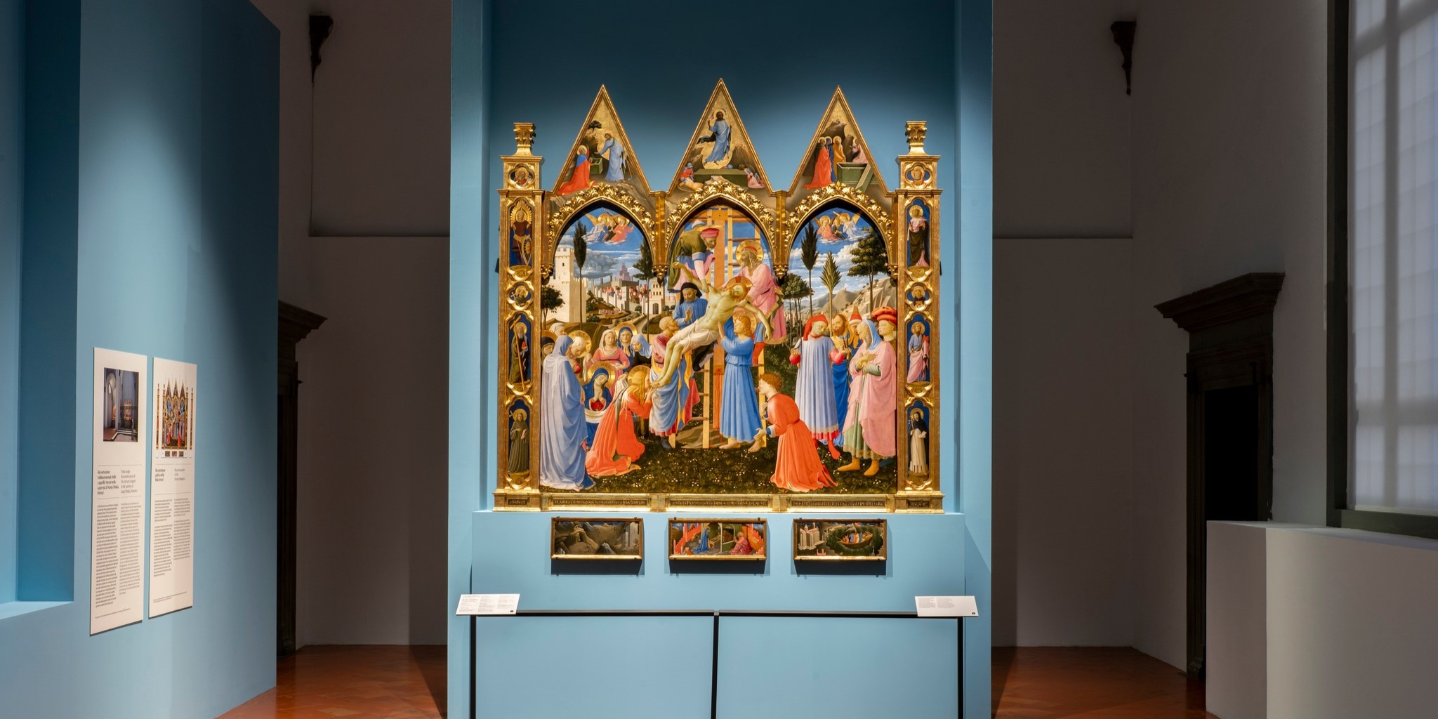 On display are paintings, drawings, sculptures and miniatures, enhanced by specially restored masterpieces, long-lost works and altarpieces reassembled for the first time in hundreds of years. Among the outstanding restorations is that of the Deposition from the Cross executed for the Strozzi Chapel in the Florentine church of Santa Trinita, housed in the Museo di San Marco, with which Beato Angelico revolutionized the model of the medieval altarpiece to create a unique space with a theatrical and engaging impact.