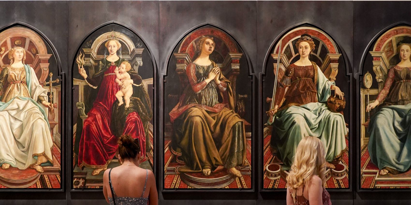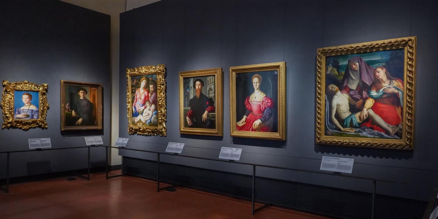 I visitatori degli Uffizi possono ammirare i capolavori in ordine cronologico, a partire dai dipinti medievali per arrivare alla stanza dedicata alle grandi pale d’altare di Giotto e Cimabue. La visita prosegue con i pittori rinascimentali toscani Piero della Francesca, Paolo Uccello e Filippo Lippi. Un’intera sala è dedicata ai celebri dipinti di Botticelli, Nascita di Venere e La Primavera. Il percorso museale continua con le opere del XV secolo da Siena, Veneto (Mantegna, Tiziano, Bellini, Correggio e Canaletto), Emilia Romagna e Lombardia. Spostandosi verso il tardo Rinascimento, troviamo i capolavori di Leonardo da Vinci, Raffaello e il Tondo Doni di Michelangelo.